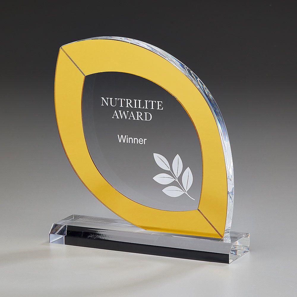 Die einem Blatt ähnelnde Form dieses Awards ist mit einer goldfarbenen Acrylglasauflage komplett eingefasst/umrundet. Diese Trophäe ist ein optischer Hingucker, der aber nicht allzu viel Platz für die lasergravur oder den Farbdruck bietet. Hier eignet sich am besten nur 1 Logo, 1 Titel, 1 Preisträger...