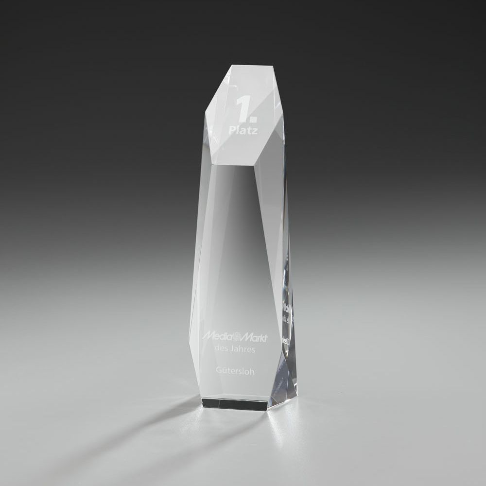 Massive Kristallglas-Säule mit 50/60mm Materialstärke, aufwendigem Facettenschliff und abgeschrägter Spitze, die ebenfalls mit einer Lasergravur versehen werden kann - ein toller Spot z.B. für eine Platzierung oder ein Logo.