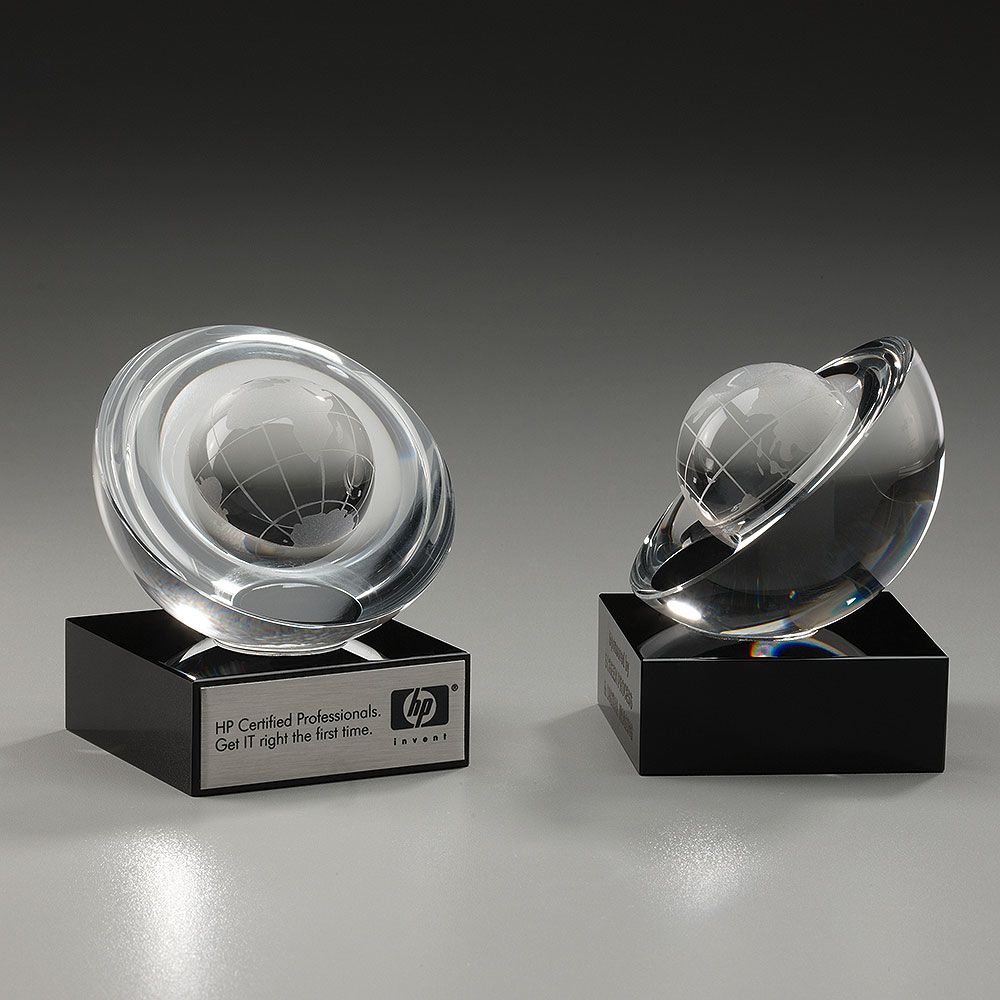 Aufgrund seiner Raffinesse und einer Gesamthöhe von 90mm ist diese Auszeichnung für jeden Schreibtisch geeignet. Das Oberteil besteht aus zwei Glasobjekten: Eine ausgefräste Halbkugel, in die eine Weltkugel (Ø 40 mm) passgenau eingelegt werden kann. Der Sockel wird direkt belasert (Maße 65x25 mm), oder mit einem Sockelschild versehen.