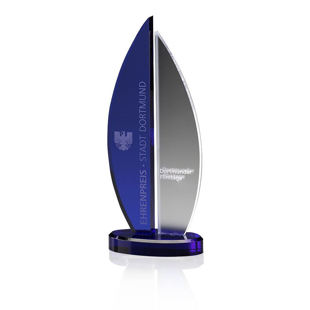 Eine dynamisch, elegante Auszeichnung mit zwei unterschiedlich starken Oberteilen und einem ovalen Sockel, der das Gesamtbild abrundet. Diese Trophäe hebt sich durch ihr ungewöhnliches Erscheinungsbild ab; sie ist auch in rotem Acrylglas als "Rosedale Fire, Artikelnummer 7330" erhältlich.