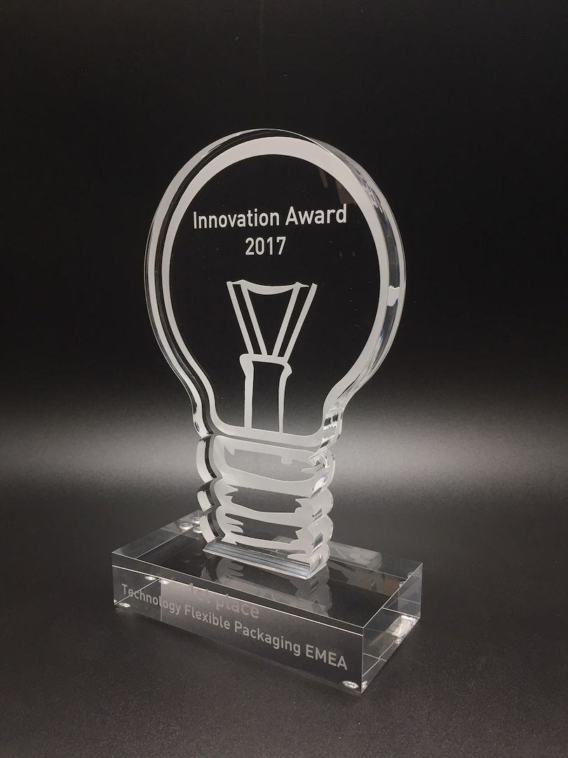 Der "Innovation Award" greift mit seiner Form das Motto auf. Eine einfache und doch so wirkungsvolle Trophäe, bei der das 10mm starke Oberteil in Form einer Glühbirne ausgeschnitten, das Motiv/die Konturen mit Lasergravur aufgebracht werden und das Ganze dann mit einen 20mm Sockel verklebt wird.