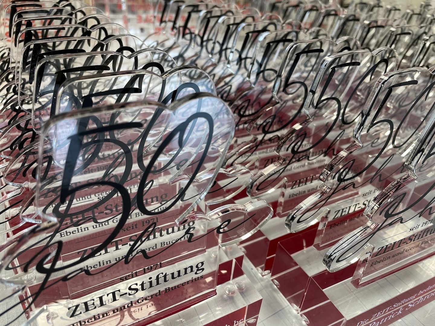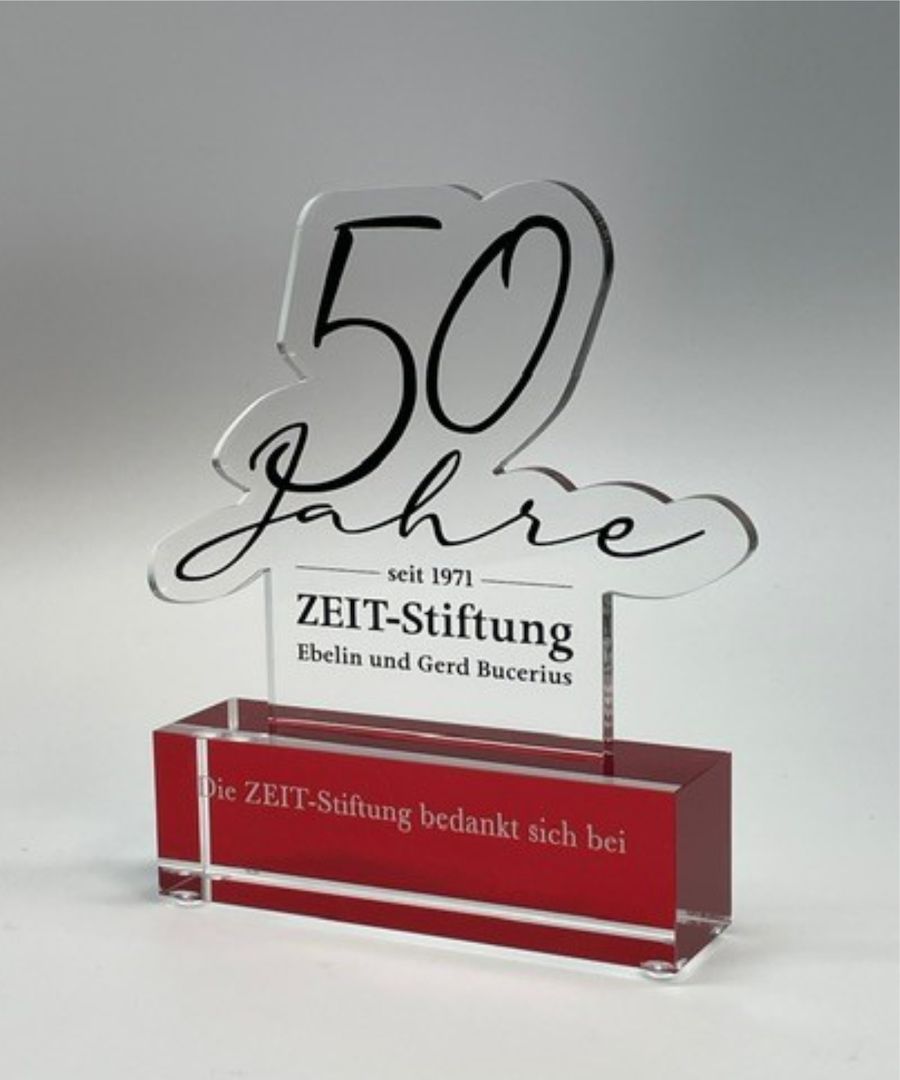Im Zuge der Jubiläumsfeier wurden u.a. über 100 "Give-Away-Awards" mit einer Höhe von 15cm vergeben. Das Highlight: Den Sockel haben wir von hinten rot bedruckt, so dass der Druck auf der Vorderseite besser zur Geltung kommt.