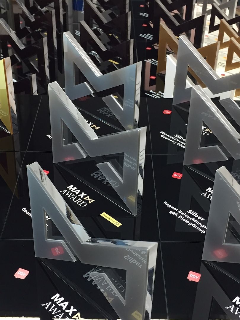 ..."Die Verleihung des ersten MAX-Awards am 28. September 2017 war ein voller Erfolg. Vor rund 150 Gästen wurde der MAX 4 Mal in Gold, 8 Mal in Silber und 15 Mal in Bronze verliehen. Mit nur 27 Medaillen ist der neue Wettbewerb des DDV für das digitale Kommunikationszeitalter ein echtes Prädikat für ausgezeichnete Dialogmarketingarbeiten...