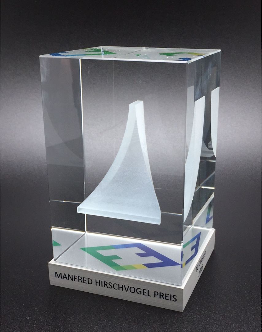 Eine außergewöhnliche und aufwendig gestaltete Trophäe, die unterschiedliche Produktionsschritte erfordert: In dem lupenreinen Glasquader (80x80x120mm) schwebt die Laserinnengravur über dem farbig gedruckten Firmenlogo. Das Oberteil steht auf einem Alusockel, welcher an allen Seiten per Digitaldruck personalisiert wurde. Diese Auszeichnung wird insgesamt 9mal im Jahr für herausragende Leistungen an Universitäten vergeben.