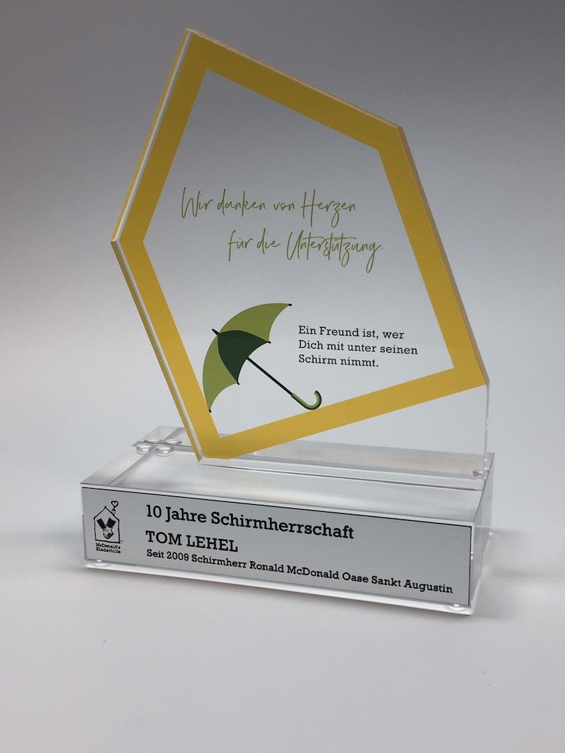 Ein liebevoller Ehren-Award für langjährige Schirmherrschaft der "McDonald Kinderhilfe" - nach Vorgabe formgeschnitten, farbig bedruckt und nach Kundenwunsch per Sockelschild personalisiert.