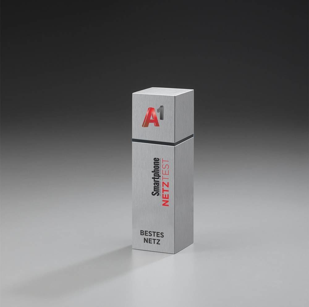 Ein beeindruckender, 2 kg schwerer Metall-Award aus massivem Alluminium - mit Feinschliff und schwarzer Acrylglastrennscheibe als Akzent und Blickfang. Statt des schwarzen Materials können auch andere Farben eingelegt werden - so könnte z.B. eine Firmenfarbe aufgegriffen werden, wenn auch nicht CI-farbgetreut, so doch zumindest Blau, Rot, Grün...
