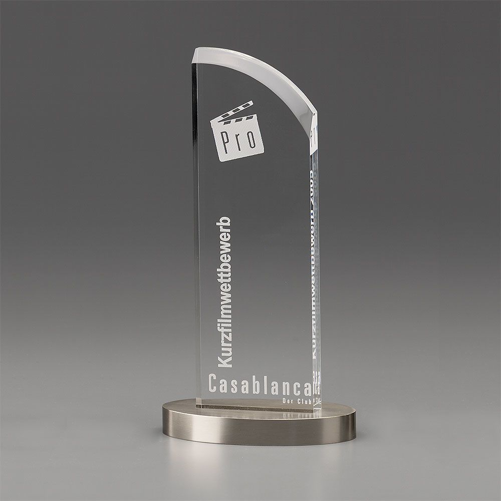 Eine Trophäe mit einer geraden, klassischen Linie, Kantenschliff "on the Top" und einem ovalen, fein geschliffenen Metallsockel. Dieser Award ist einer der beliebtesten aus der Kategorie "Acryl + Metall Awards", wohl aufgrund seines zeitlosen Designs.