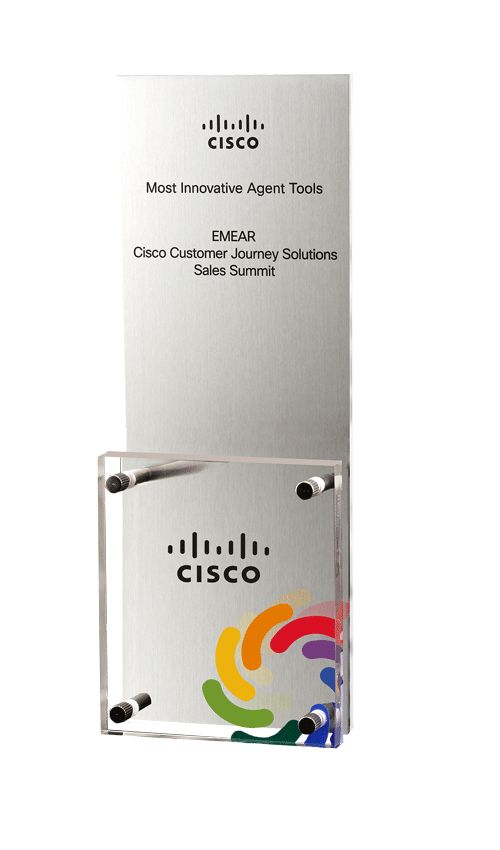 Bei dieser Trophäe wird per Abstandshalter vor die Aluminiumplatte ein 10mm starkes Acrylquadrat gestellt, so dass sowohl das Vorder/-, als auch das Rückteil per Farbdruck veredelt werden kann.