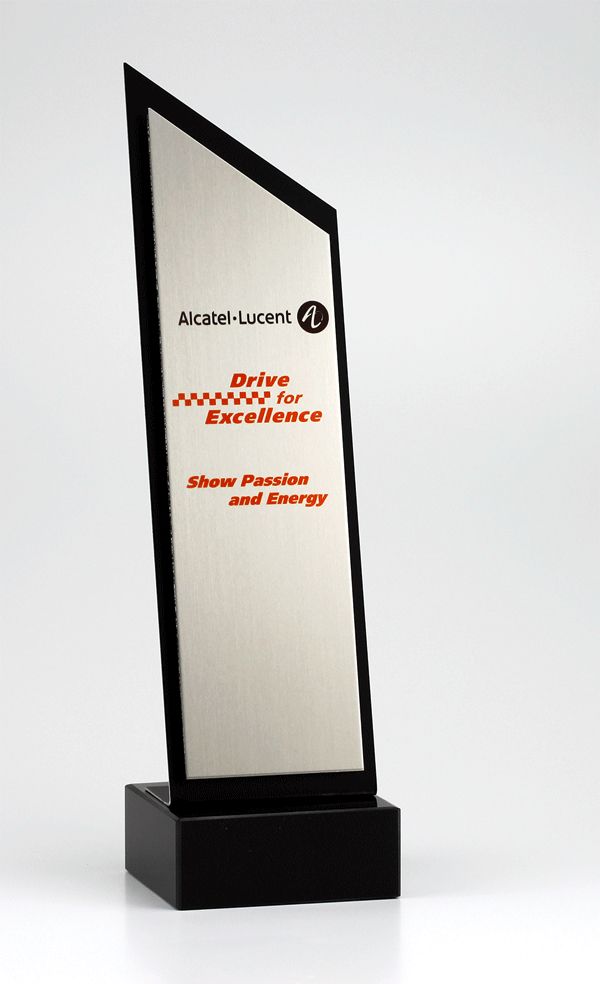 Diese Trophäe ist kombiniert aus einem schwarz eloxierten Aluminiumträger und einer fein geschliffenen, silbermetallic Aluplatte. Die Personalisierung erfolgt durch einen farbigen UV-Druck (auf dem Vorderteil).