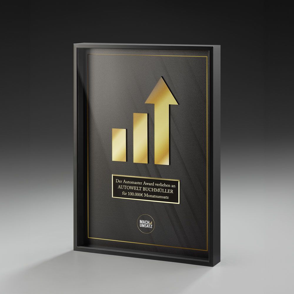 Der Aufbau dieses Zertifikatrahmens "Milestone Frame / schwarz" ist dreiteilig: Eine Grundplatte aus schwarz durchfärbtem Acrylglas (matt) + edler, schwarzer Aluminiumrahmen mit einer Tiefe von 30mm + transparente Deckplatte. Das Innenleben wird nach Ihren Vorstellungen gestaltet, Sie haben verschiedene Optionen wie Farbdruck, freie Formen aus unserem Metallic-Art-Material, Metall-Applikationen, themenbezogene Designelemente...