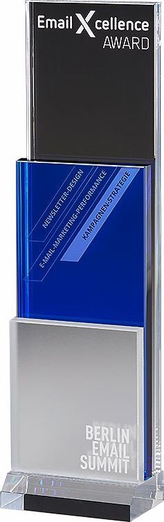 Bei dieser dreistufigen Trophäe stehen ein weiß satiniertes Vorderteil, ein blaues Mittelteil und ein transparentes Rückteil (hier mit grauem Hintergrund dargestellt, da sonst nicht erkennbar) in drei Höhenstufen hintereinander auf einem transparentem Sockel. Ein Award mit 3D-Effekt, der eine akzentuierte Aufteilung von z.B. Logo, Text, Preisträgername erlaubt .