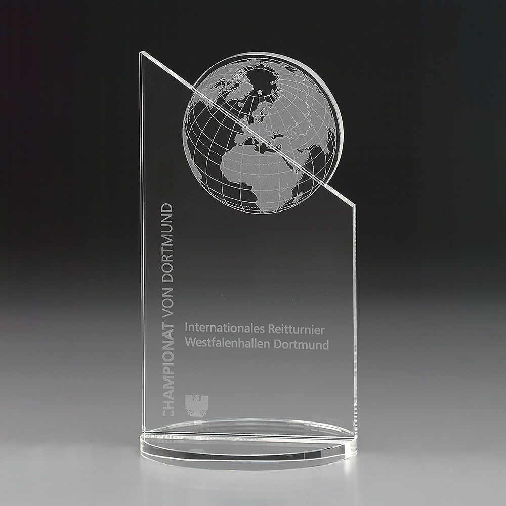 Eine Glas-Trophäe mit einem aufgesetztem Halbkreis, in welchen man z.B. entweder ein rundes Logo, oder eine Weltkugel (siehe Abbildung) integrieren kann. Ein interessanter optischer Effekt und viel freier Platz für die Textgravur.