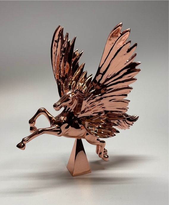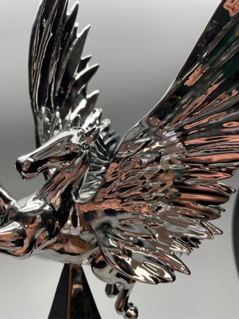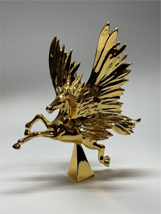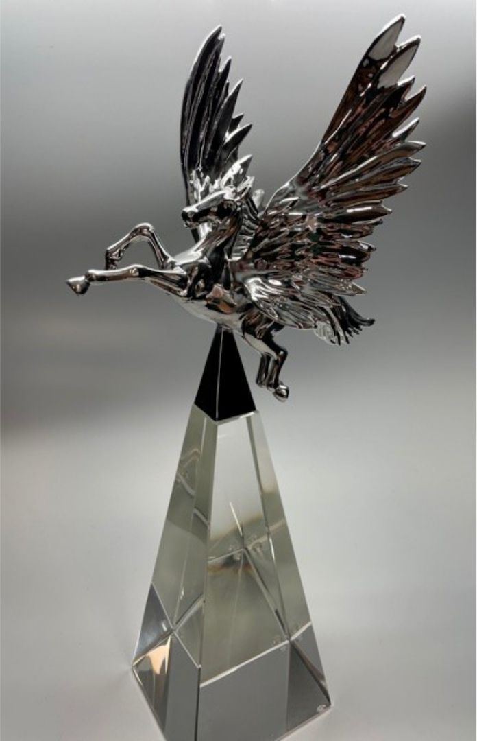 Edler geht "awarding" wohl nicht mehr: Der 230mm hohe Kristallsockel beginnt mit einer Breite von 110x110mm, läuft dann spitz zu und wird von massiven 3D-Metallgusspegasusfiguren in Gold, Silber und Bronze gekrönt.