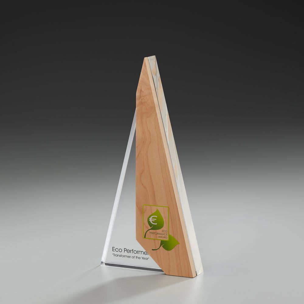 Modernes Award-Design aus einem Glas-Tombstone mit 20mm Materialstärke und einem formschönen Holzpendant, welcher der Auszeichnung auf der einen Seite Leichtigkeit verleiht, auf der anderen Seite dessen Standfestigkeit verstärkt.