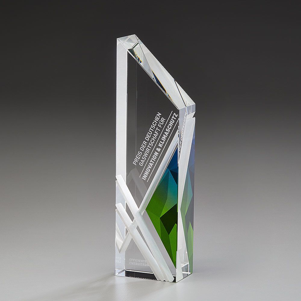 Eine massive Glastrophäe in der beliebten "Peakform", bei der durch das abstrakte Design, Logos/Farbmotive/Titel/ Text aufgeteilt und voneinander getrennt werden können.