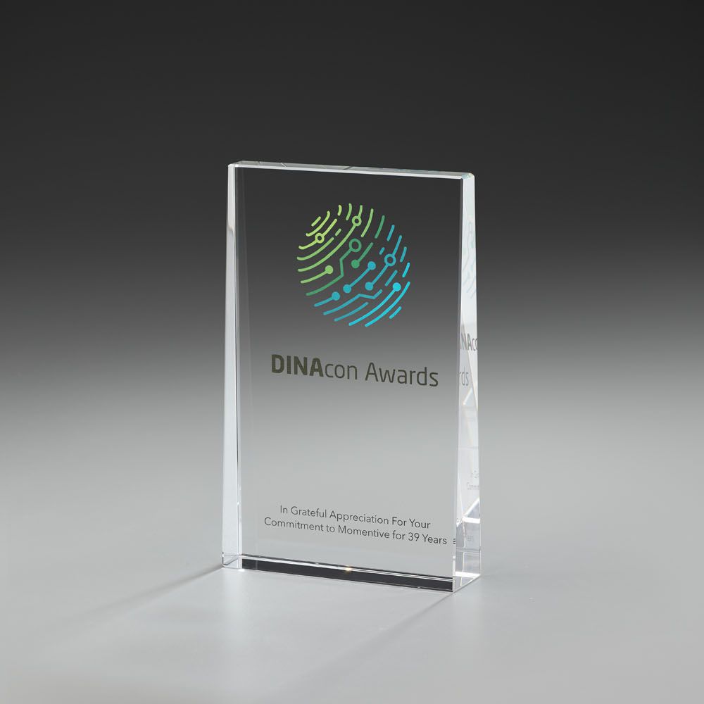 Ein zeitloser Glas-Tombstone, der mit einer Materialstärke von 32mm schön stabil steht und sich nach oben hin auf 15mm verjüngt. Mit 205mm Höhe passt er als exklusiver Aufsteller auf jeden Tresen/Schreibtisch und wird mit einem farbigen Druck so richtig zum Hingucker.