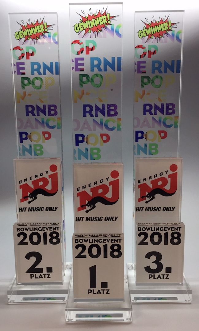 Super schöne, farbige, 420mm hohe Bowlingtrophäe von "Radio Energy", mit 3 verschiedenen Ebenen, alle unterschiedlich farbig bedruckt.