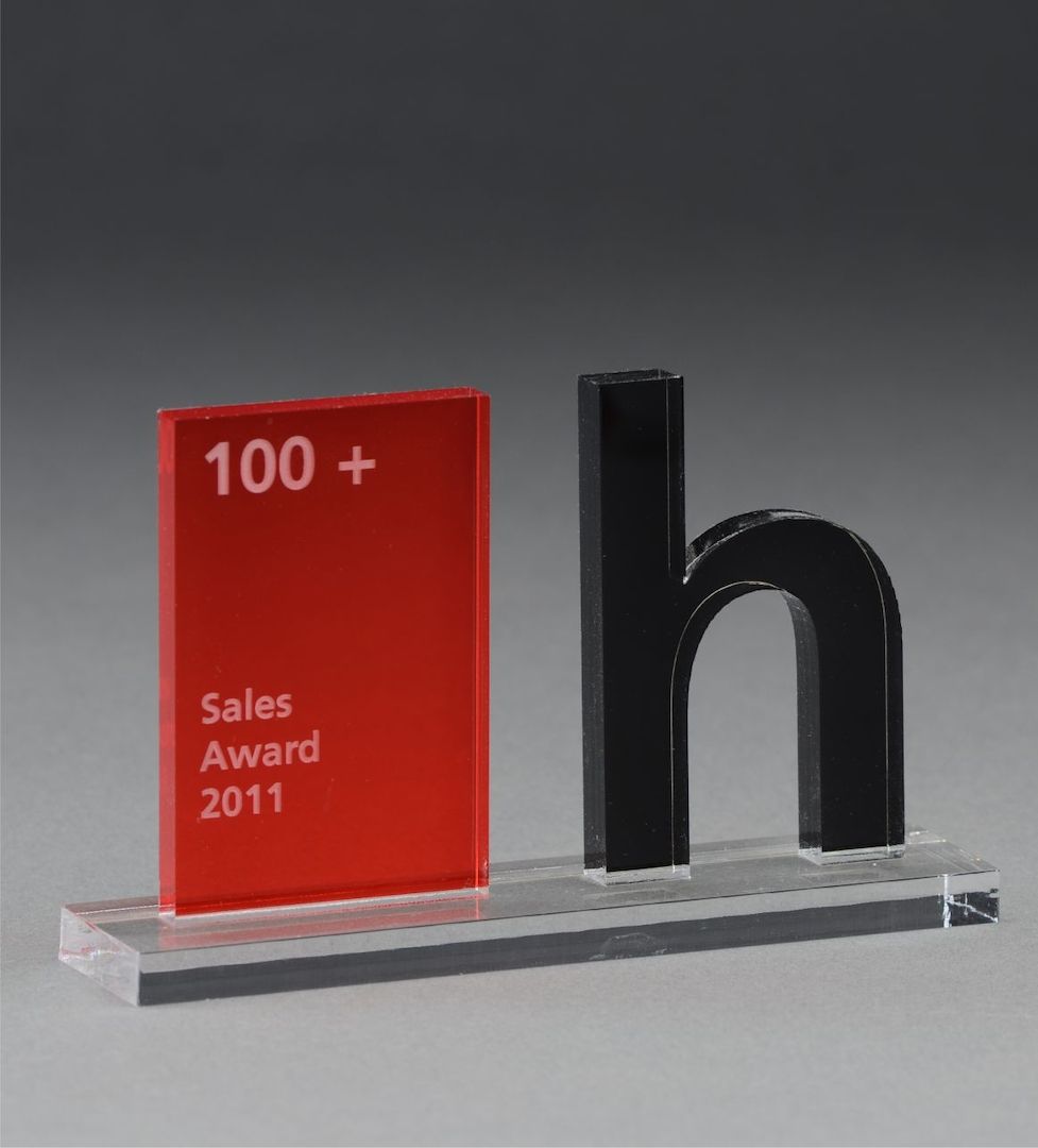 Diese Sonderanfertigung setzt sich aus drei Teilen zusammen: Oberteil mit Digitalbedruckung hinten und Lasergravur vorne, konturgeschnittener Buchstabe, vollflächig bedruckt, sowie dem Sockel.