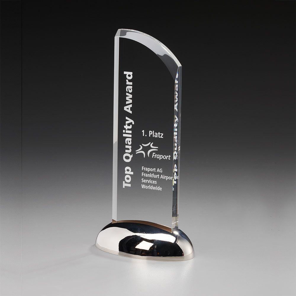 Das Pendant zu unserem "Metal Wing Award - Artikelnummer 7430": Hier das gleiche Oberteil mit breiter Zierfacette "on top" und gewölbtem, hochglanzpolierten Metallsockel. Eine Geschmacksfrage, welche Kombination besser gefällt, aber so oder so ein erstklassiges Business-Present.