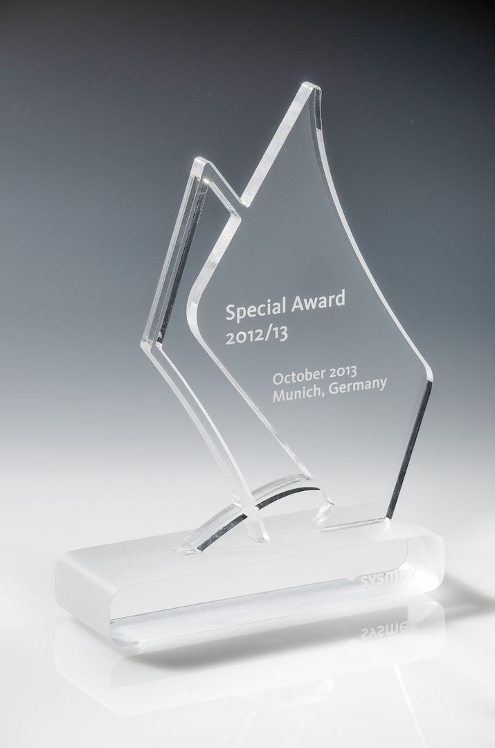 Nomen est omen: Dieser "Special"-Award sticht durch seine auffällige Formsprache ins Auge. Das 10mm starke Oberteil dieser Trophäe wurde per Laser aus der Acrylplattenware ausgeschnitten und per UV-Verklebung auf einen satinierten Sockel mit abgerundeten Kanten gesetzt. Eine ästhetische Auszeichnung!