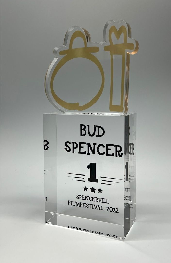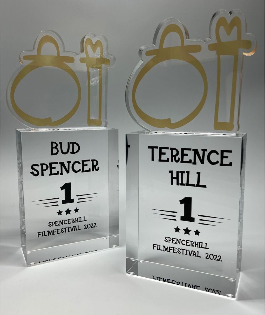 Awards für das 1. "Spencerhill Filmfestival" in Berlin - mit innovativem Design: Hier ist das Oberteil kleiner angelegt, als der Sockel, der mit Maßen von 120 x 160 x 60mm Tombstone-Format erreicht und natürlich viel Platz bietet für den UV-Farbdruck.