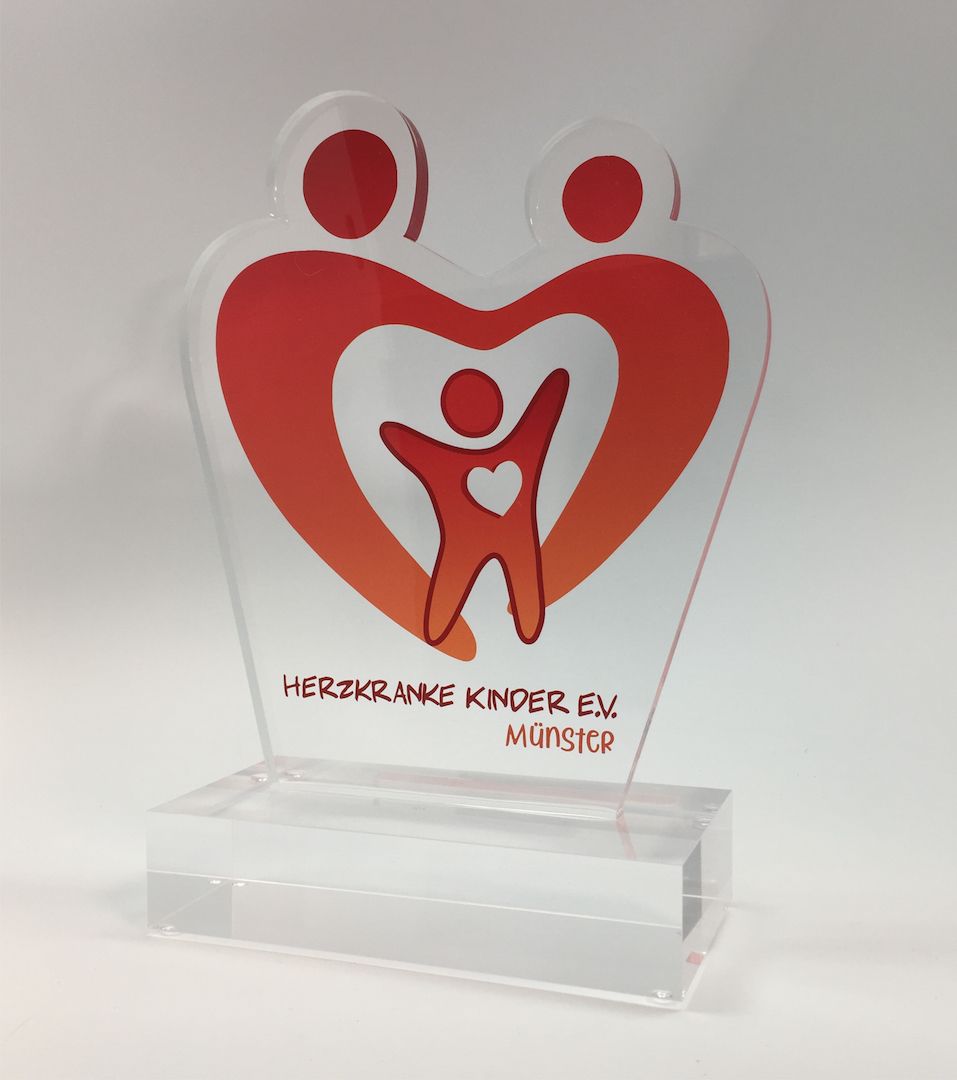 Hier wurde als Außenkontur die Form des Bildlogos wiederholt, das Oberteil einseitig farbig bedruckt und auf einen kompakten Sockel gestellt, was dem Award noch mehr Wertigkeit gibt.
