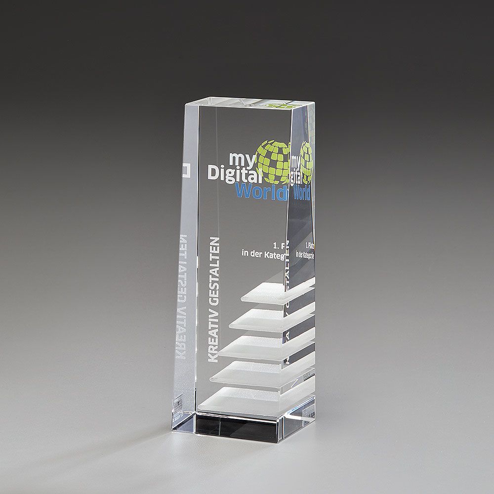 Eine 50mm starke Kristallglassäule, mit eingefrästen Stufen. Dieser exklusive Award greift symbolisch das Thema "Treppe zum Erfolg auf" und eignet sich wunderbar als Business-Auszeichnung.
