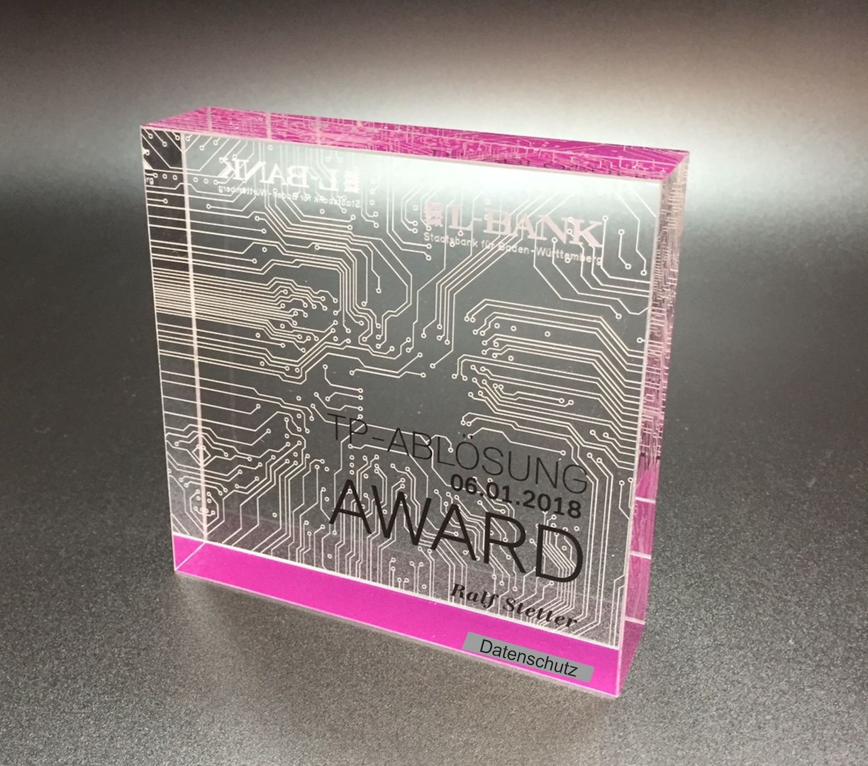 Die Kombination aus Lasergravur, Farbdruck und Folienaufbringung, sowie die dadurch entstehenden Farbspiegelungen machen diesen Awardaufsteller zu einem richtigen Hingucker.