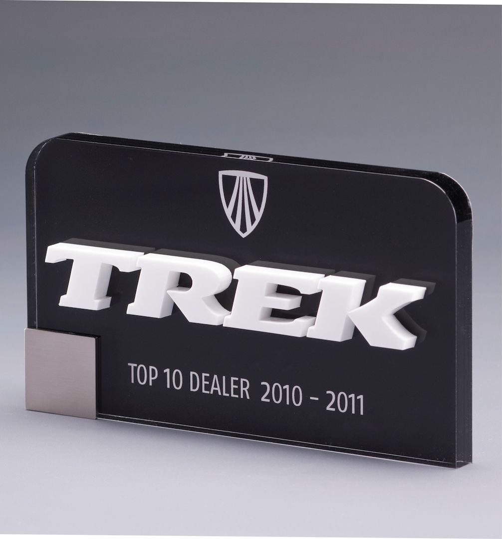 Diese Auszeichnung wird alle 2 Jahre an die "Top 10 Verkäufer" der Schweiz, Österreichs und Deutschlands vergeben. Die 10mm starken Acrylglasplatten (175mm x 100mm) werden vollflächig digital mit Text/Titel bedruckt, während das jeweilige Unternehmenslogo aus farbigem Acryl geschnitten und aufgesetzt wird. Die einseitige Edelstahlstütze sorgt für Standfestigkeit.