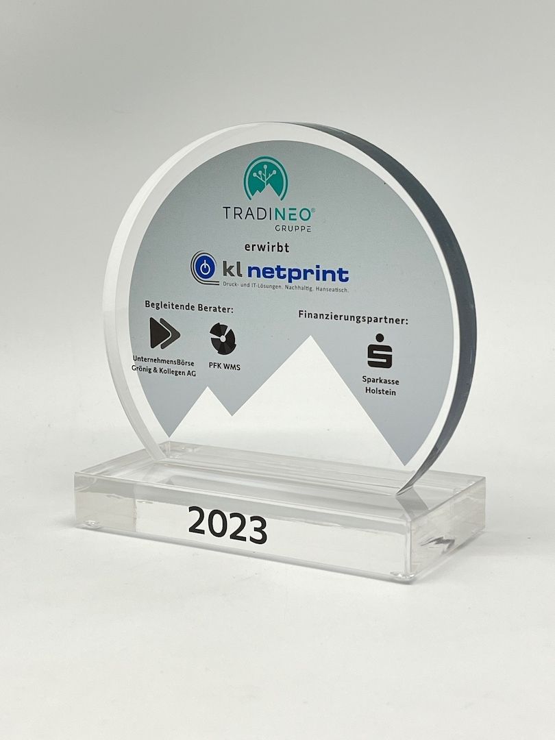 Unser Kunde hat sich den EcoAcryl-Award "Round" ausgesucht, wollte diesen aber mit andern Maßen haben. Kein Problem: 100% recyceltes Acrylglas, Laserschnittverfahren, Oberteil 150x130mm auf 20mm hohen Sockel. Die Awards wurden zweiseitig bedruckt, auf der Rückseite im "satiniertem Look", auf der Vorderseite mit Logo und Text.