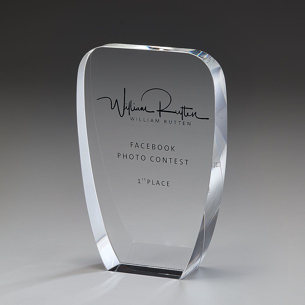 Eine massive Glastrophäe mit einer Glasstärke bis zu 50mm und einer Höhe von 200mm, welche zwar durchaus als "Tombstone" bezeichnet werden kann, sich aber von der Geradlinigkeit solcher Aufsteller durch die geschmackvolle Form unterscheidet.