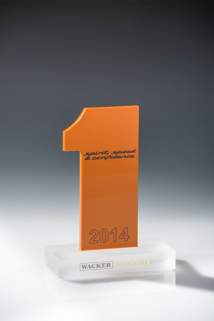 Das konturgeschnittene Oberteil aus durchfärbtem Acryl-Material steht sinnbildlich für Erfolg/Sieg. Diese Auszeichnung wurde an jeden Mitarbeiter eines Teams, in mehreren Kategorien vergeben. Die Namen aller dem Team zugehörigen Mitarbeiter wurden per UV-Farbdruck unter die jeweilige Kategorie gedruckt (hier aus Datenschutzgründen nicht sichtbar). Einen stimmigen Kontrast bildet der satinierte Sockel, der mit dem Unternehmenslogo bedruckt wurde.