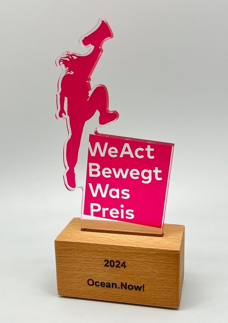 Ocean.Now! gewinnt den diesjährigen "WeAct Bewegt-Was-Preis"! Die Organisation wird für ihre langjährige, hartnäckige und kreative Kampagnenarbeit ausgezeichnet und bekommt bei der Feier zu Campacts 20-jährigen Jubiläum im November 2024 den "Ocean.Now! Preis" feierlich überreicht.