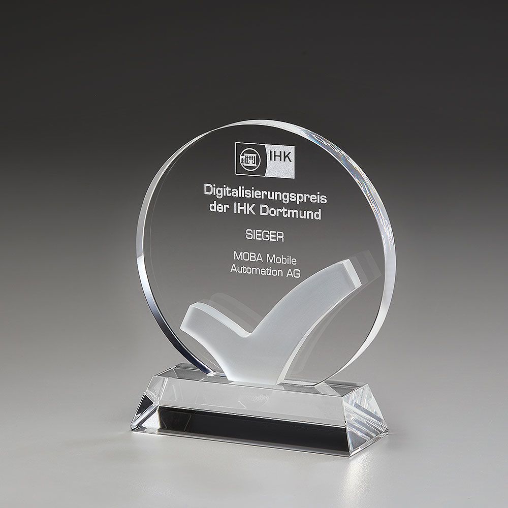 Eine Auszeichnung, die für sich spricht und motiviert: Auf dem runden, glasklaren Oberteil ist ein sandgestrahlter "Gut-gemacht-Haken" als 3D-Applikation aufgebracht.