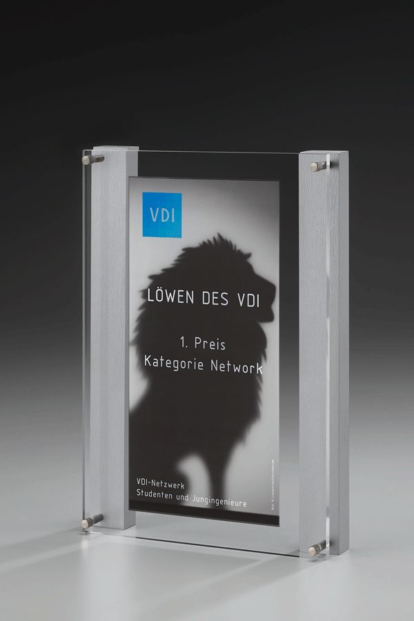 Bei diesem "Certificate Award" werden nur zwei silberfarbene Holzstelen verwendet, auf welchen per Abstandhalter eine Acrylplatte besfestigt ist, die sich sowohl für Lasergravur ("milchig" weiß), als auch für einen UV-Farbdruck (alle C/M/Y/K-Farbwerte) eignet.