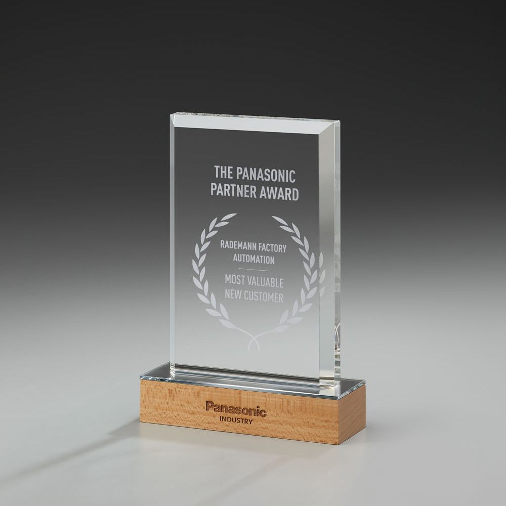 Das 180mm hohe Oberteil wird durch die breite Facette dominiert, bietet aber trotzdem viel Platz für Logos/Texte/Motive. Im harmonischen Kontrast zu dem glasklaren Oberteil steht der 30mm hohe Holzsockel.
