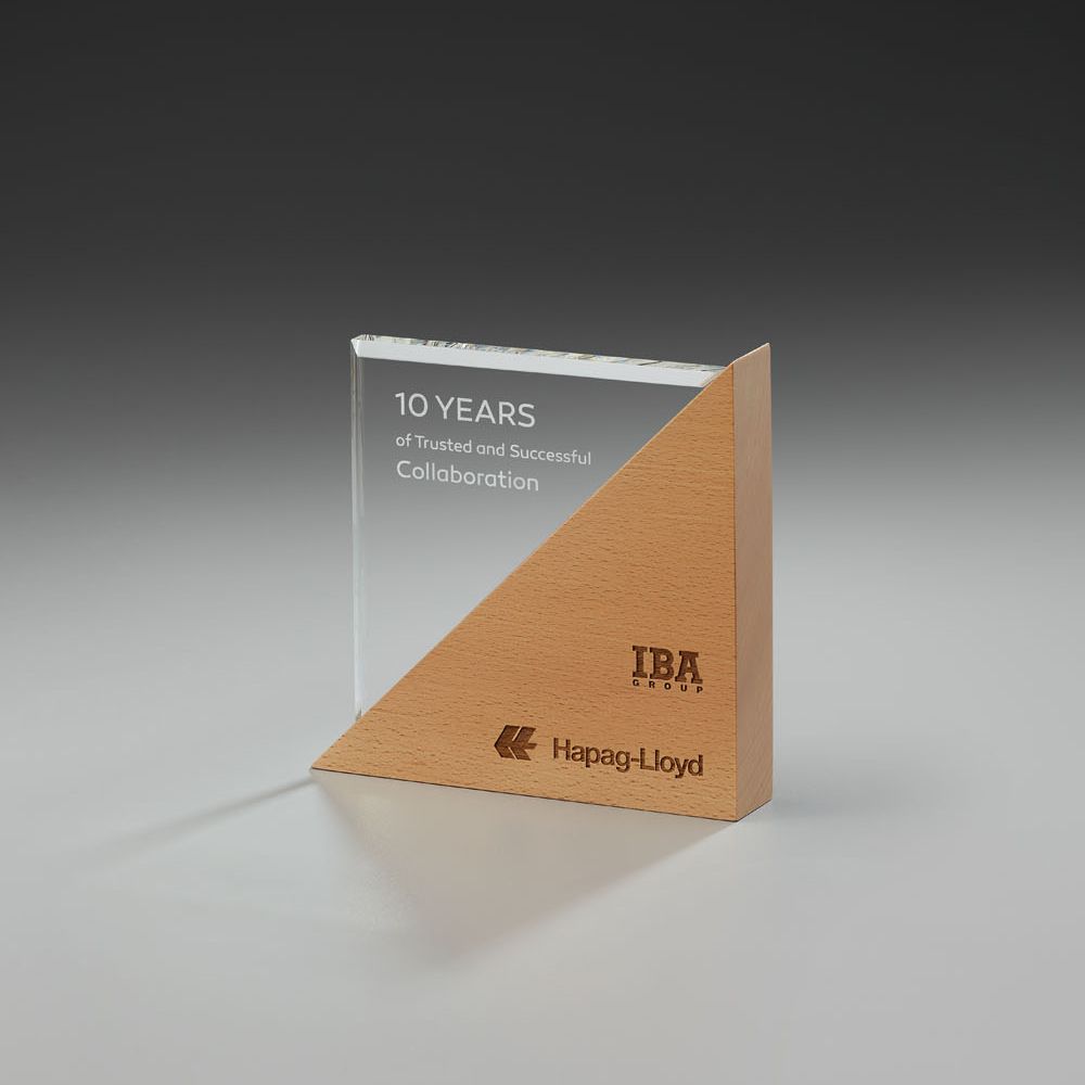 Schöner, ansprechender Aufsteller aus zwei ungleich großen Dreiecken - einem etwas kleineren Kristallglasteil mit breitem Facettenschliff + einem größeren, breiteren Holzblock. Die beiden ungleichen Flächen eignen sich hervorragend für eine Aufteilung von Logo/s und Text/en, oder Motiven und Texten.