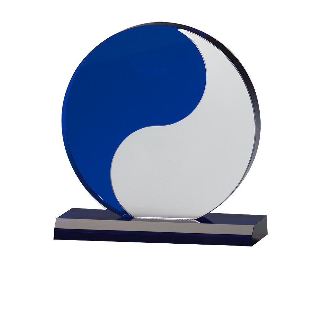 Eine Trophäe, die das Thema des "Yin und Yangs" spiegelt, also symbolisch für Gegensätze und Gleichgewicht steht. Die gefrostete-silberfarbene Gravurfläche ist direkt auf dem blauen Grundkörper angebracht. Dieser Award ist auch in rotem Acrylglas, als "Fire Circle, Artikelnummer 7333" erhältlich.