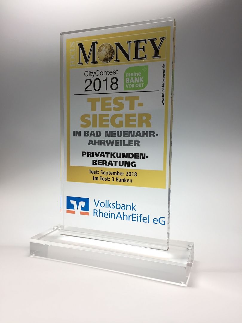 Endlich eine Alternative zur herkömmlichen Urkunde: Ein Zertifikataufsteller aus Acrylglas. Diese Auszeichnung wird in verscheidenen Größen und Designs für Testsieger im Bankkundenbereich Privat/- und Geschäftskunden vergeben.