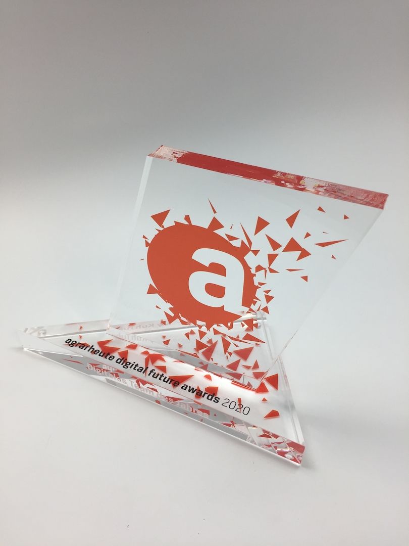 Eine neu gedachte, innovative Trophäe aus einem rautenförmigen Oberteil und einem dreieckigen Sockel - das Ganze mit einem auffälligen Farbdruck. Da es perspektivisch wirklich schwierig war, diesen Award ohne optische Verzerrung zu fotografieren, haben wir uns für die „Draufansicht“ entschieden.