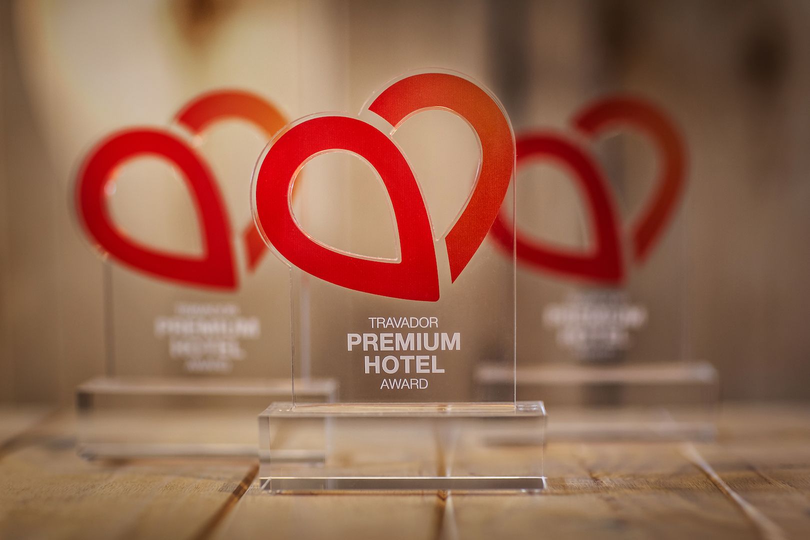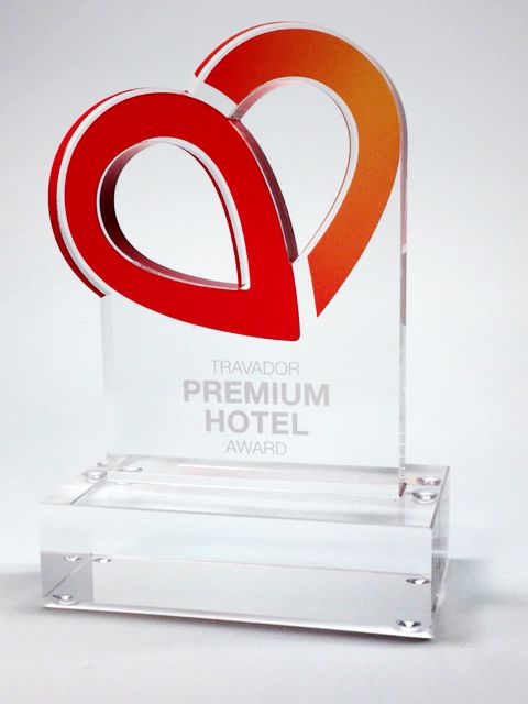 Bei diesen Trophäen wurde nur der obere Part des Unternehmenslogos an der Konturlinie innen und außen ausgefräst, der untere Teil geht in eine transparente Acrylscheibe über, die genügend Fläche für den Award-Titel (Lasergravur) bietet. Dadurch, dass das Logo überproportional viel Platz einnimmt und in leuchtend rot/-orangen Signalfarben gehalten ist, ist der Eyecatcher-Effekt am POS garantiert.